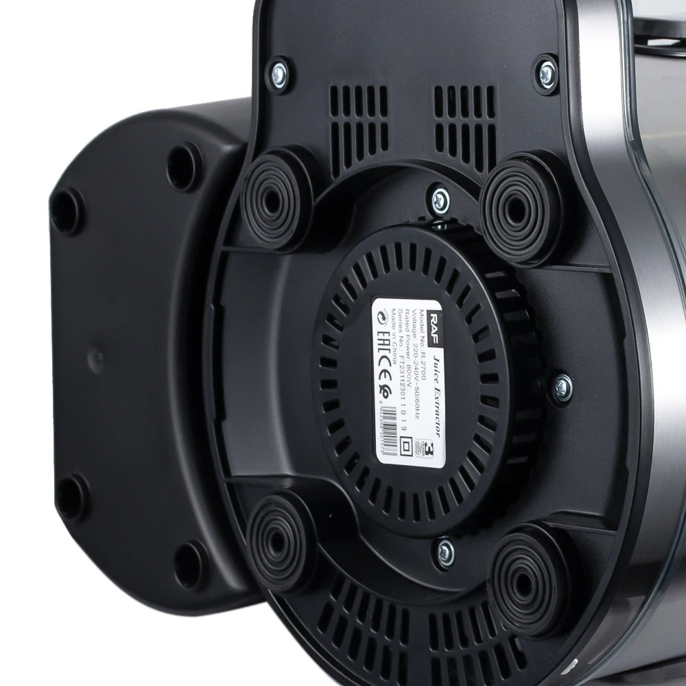 - Potencia de 800W: El exprimidor funciona con un potente motor de 800 vatios, lo que garantiza una extracción eficiente y rápida del jugo de frutas y verduras.