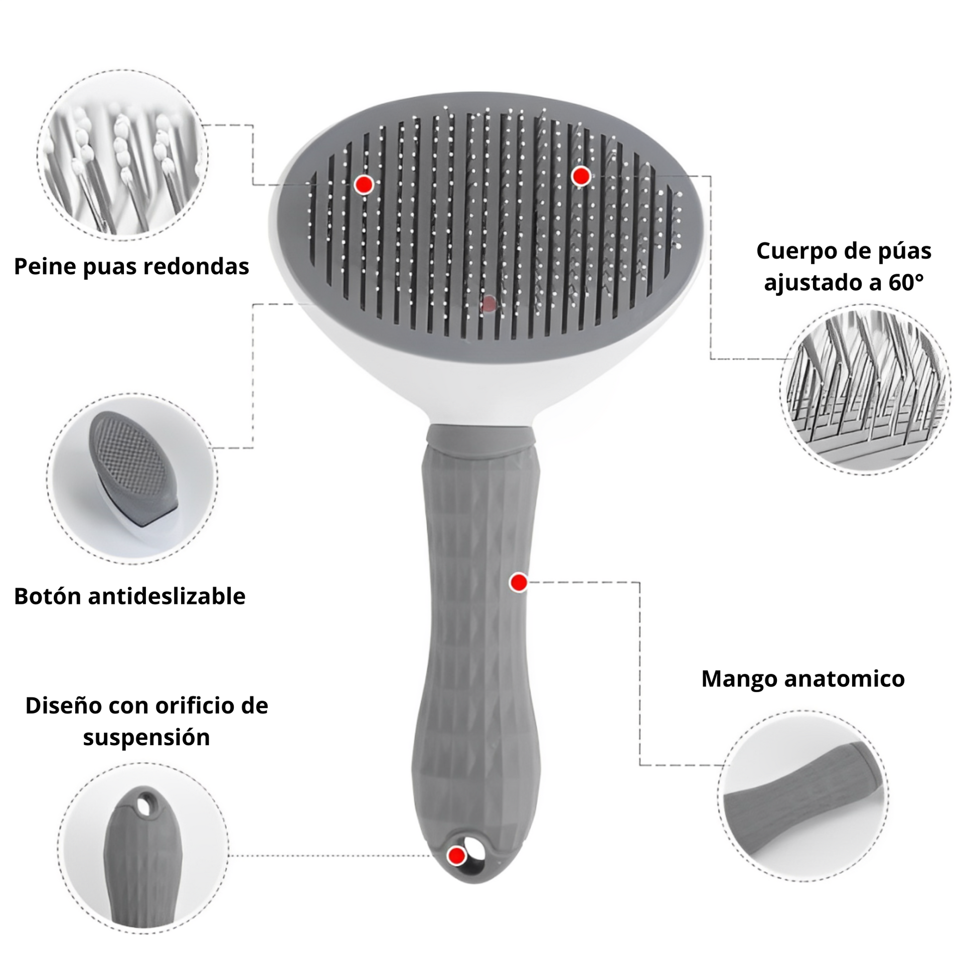 Este peine quitapelo para mascotas es ergonomico y viene en tres colores: azul, gris y rosado. Cuenta con un boton para expulsar los pelos, lo que lo hace facil de usar. Remueve eficientemente los pelos de tu mascota, dejando su pelaje suave y libre de enredos. Disfruta de un pelaje saludable y limpio con este peine de calidad.